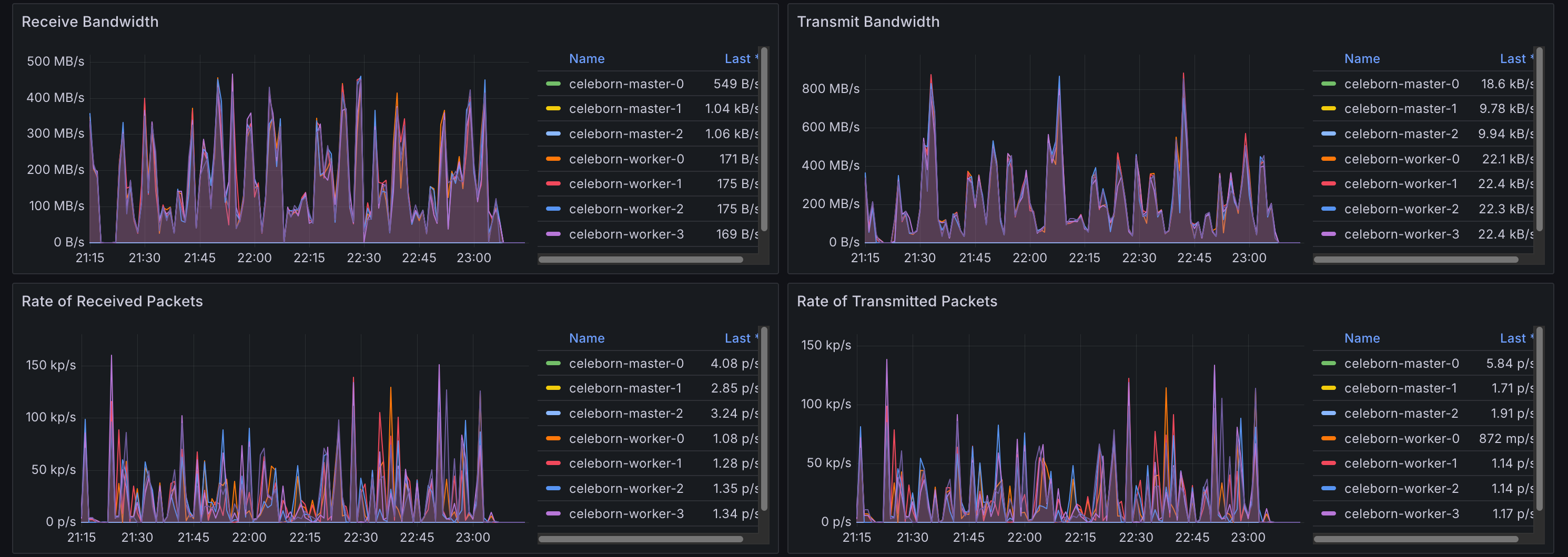 With the native shuffler, network traffic is typically limited to reading data from the source and inter-node communication for tasks. With Celeborn, all shuffle data is transmitted over the network, leading to a significant increase in network utilization on Spark pods and high ingress on Celeborn worker pods.