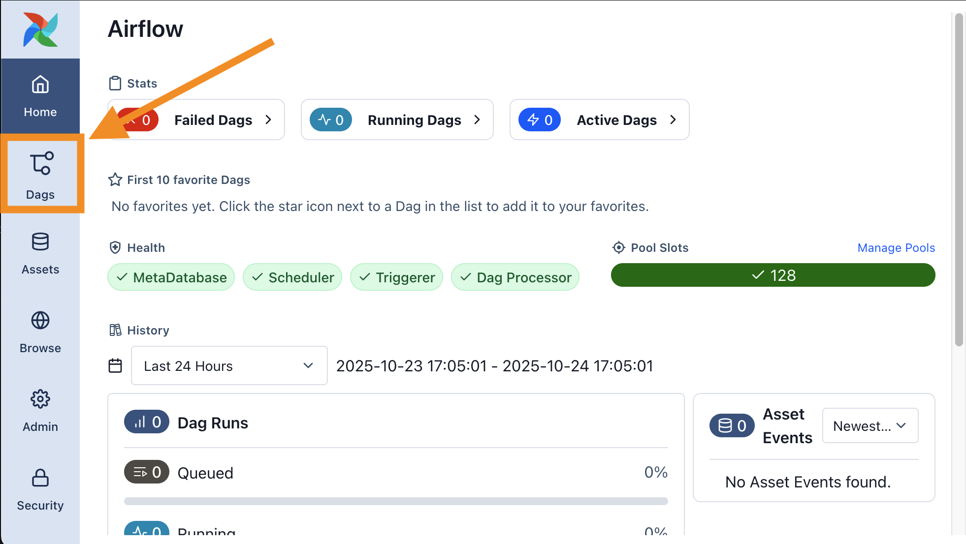 - Navigate to the Dags page from the main menu. You will see a list of DAGs pre-loaded via the DAG Bundles feature.