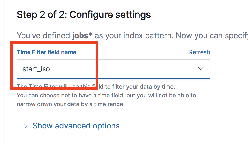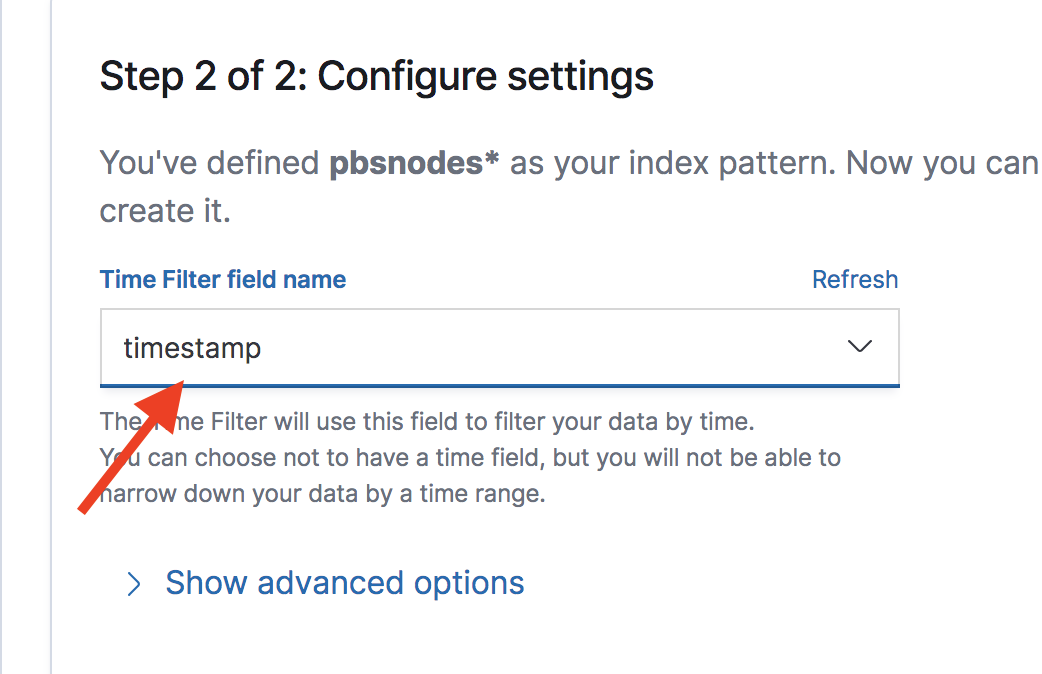 Click next, and then specify the Time Filter key (timestamp). Once done, click Create Index Pattern.