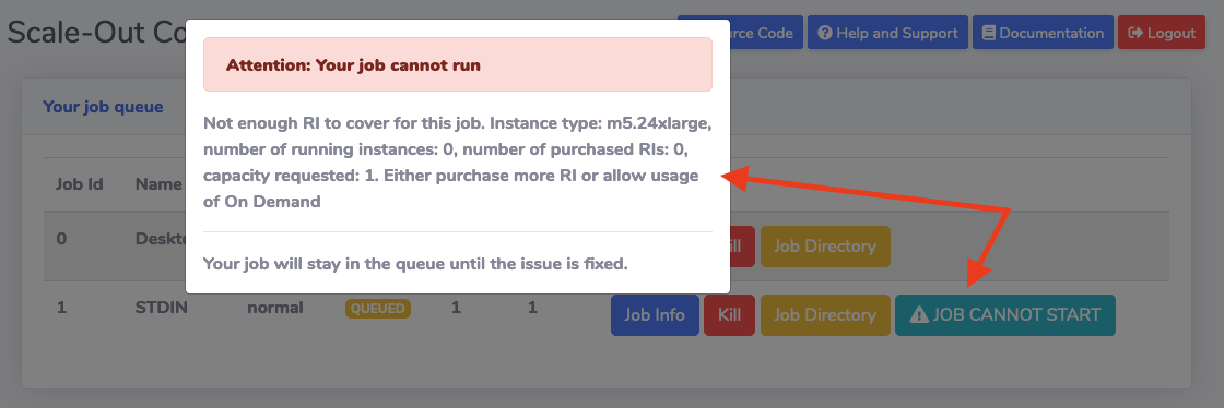 Your job will stay in the queue if you do not have any Reserved Instance available.