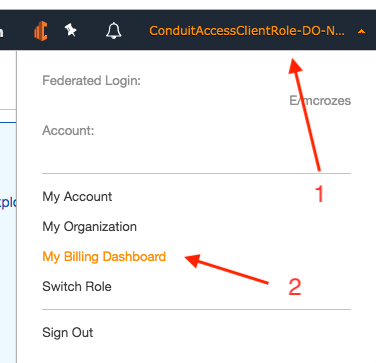 Click on your account name (1) then select "My Billing Dashboard" (2)