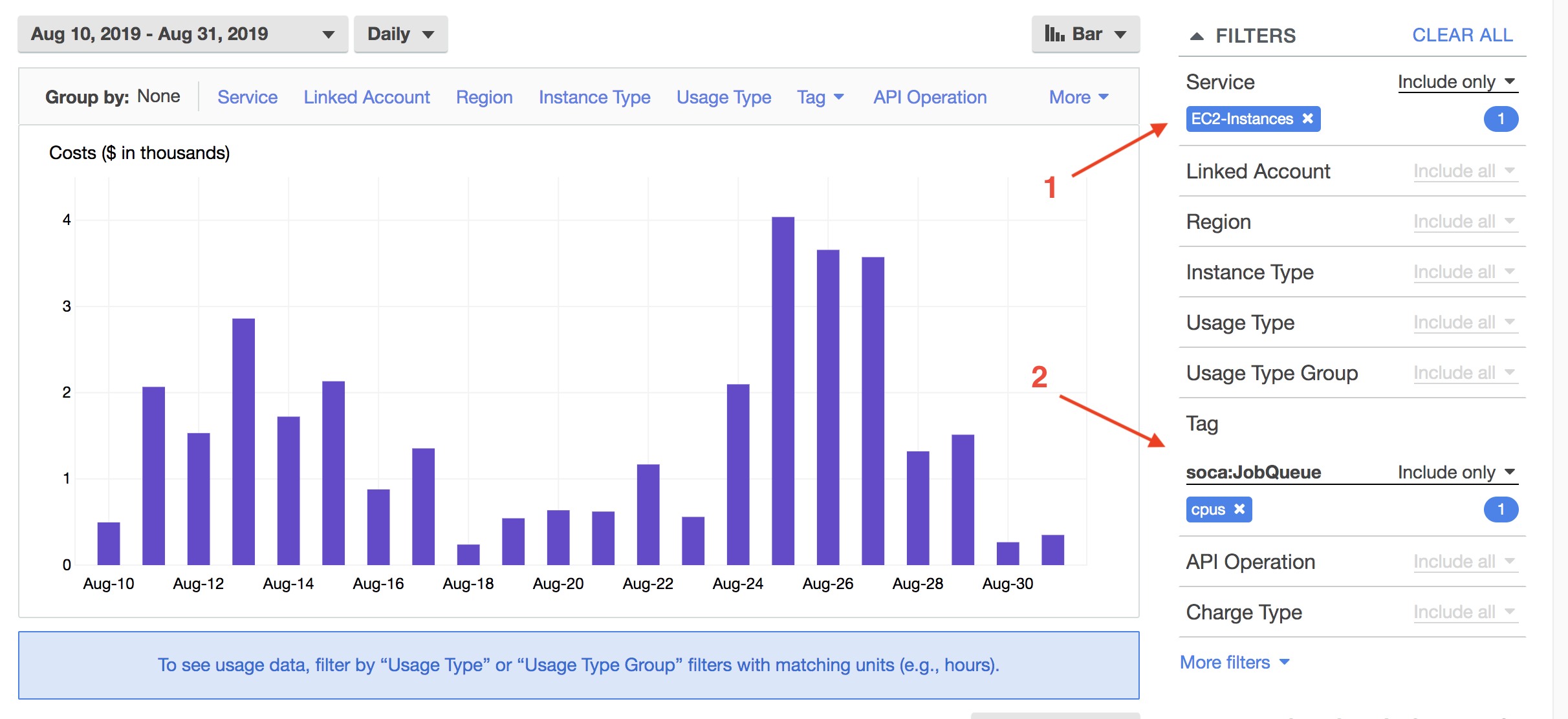Open your Cost Explorer tab and specify your filters. In this example I want to get the EC2 cost (1), group by day for my queue named "cpus" (2).