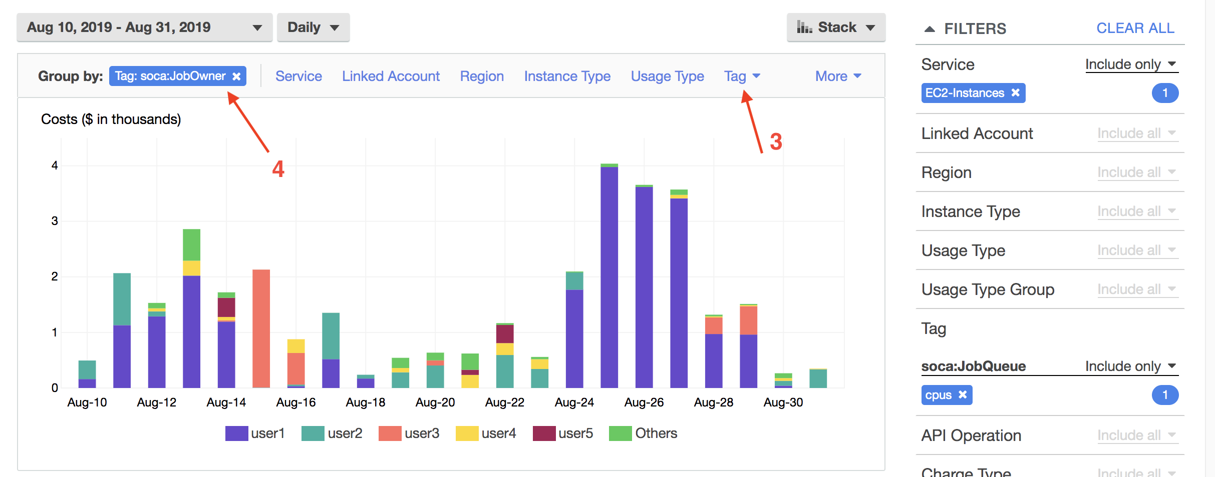 To get more detailed information, select 'Group By' and apply additional filters. Here is an example if I want user level information for "cpus" queue Click "Tag" section under "Group By" horizontal label (1) and select "edh:JobOwner" tag. Your graph will automatically be updated with a cost breakdown by users for "cpus" queue