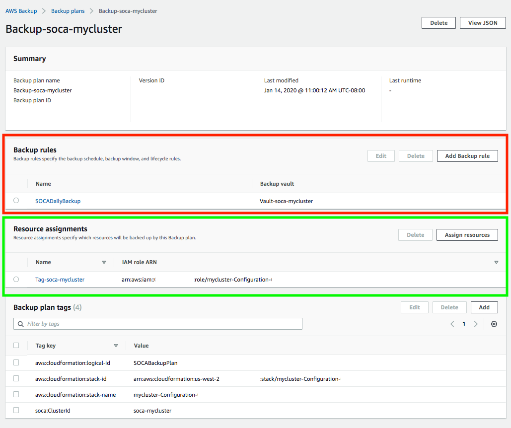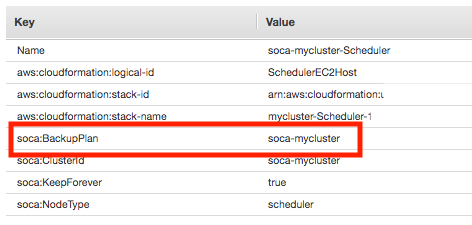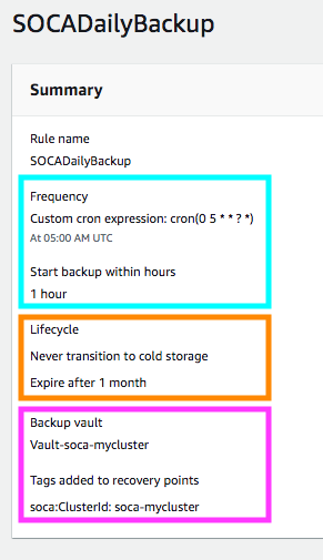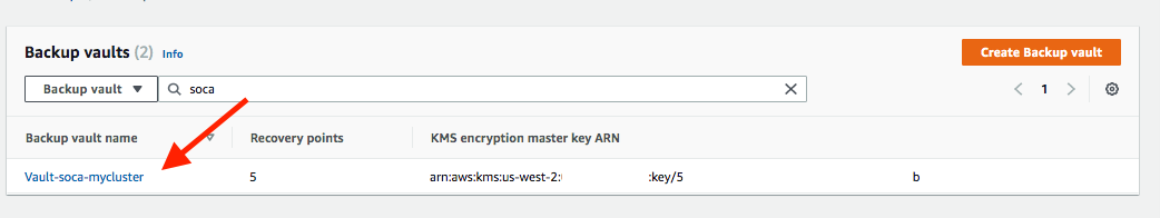 A "Backup Vault" is where all your backups are stored. Your vault is automatically encrypted using your Key Management Service (KMS) key and reference to your cluster ID (soca-mycluster in this example)