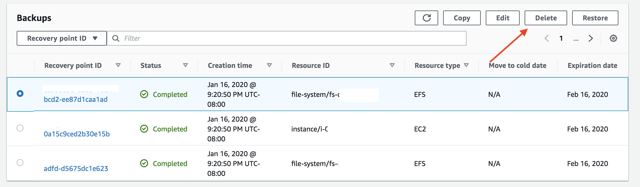 By default, Engineering Development Hub backup all data using the edh:BackupPlan tag. Value of this tag must match your cluster ID (edh-mycluster in this example).