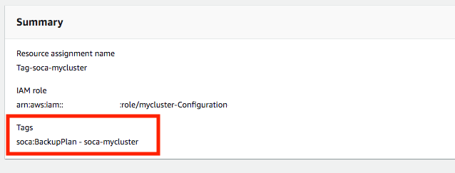 Backup resources are managed by edh:BackupPlan tag. The value of this tag must match the value of your Backup Plan (by default it should match the name of your cluster).