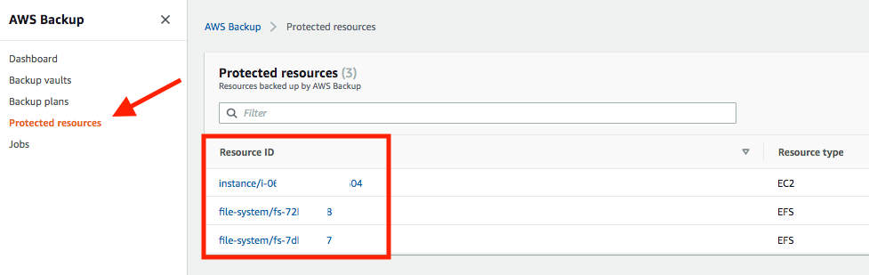 On the left sidebar, click "Protected Resources" then choose the resource you want to restore