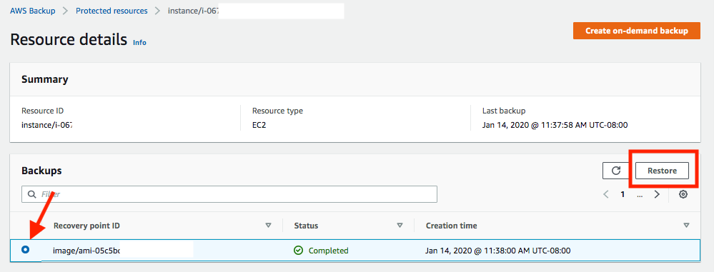 This will open a new window with additional information about this resource (either EFS or EC2). Select the latest entry you want to restore from the "Backups" section then click "Restore"
