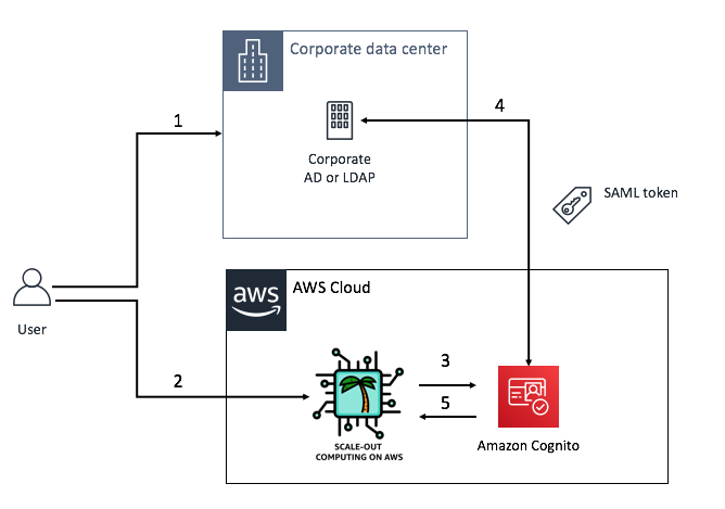 - 3: Assuming SSO is enabled, EDH will forward the access request Cognito which will use Mary's Corporate LDAP as a Federated identity to determine if she is a valid user. This is the authentication part.
