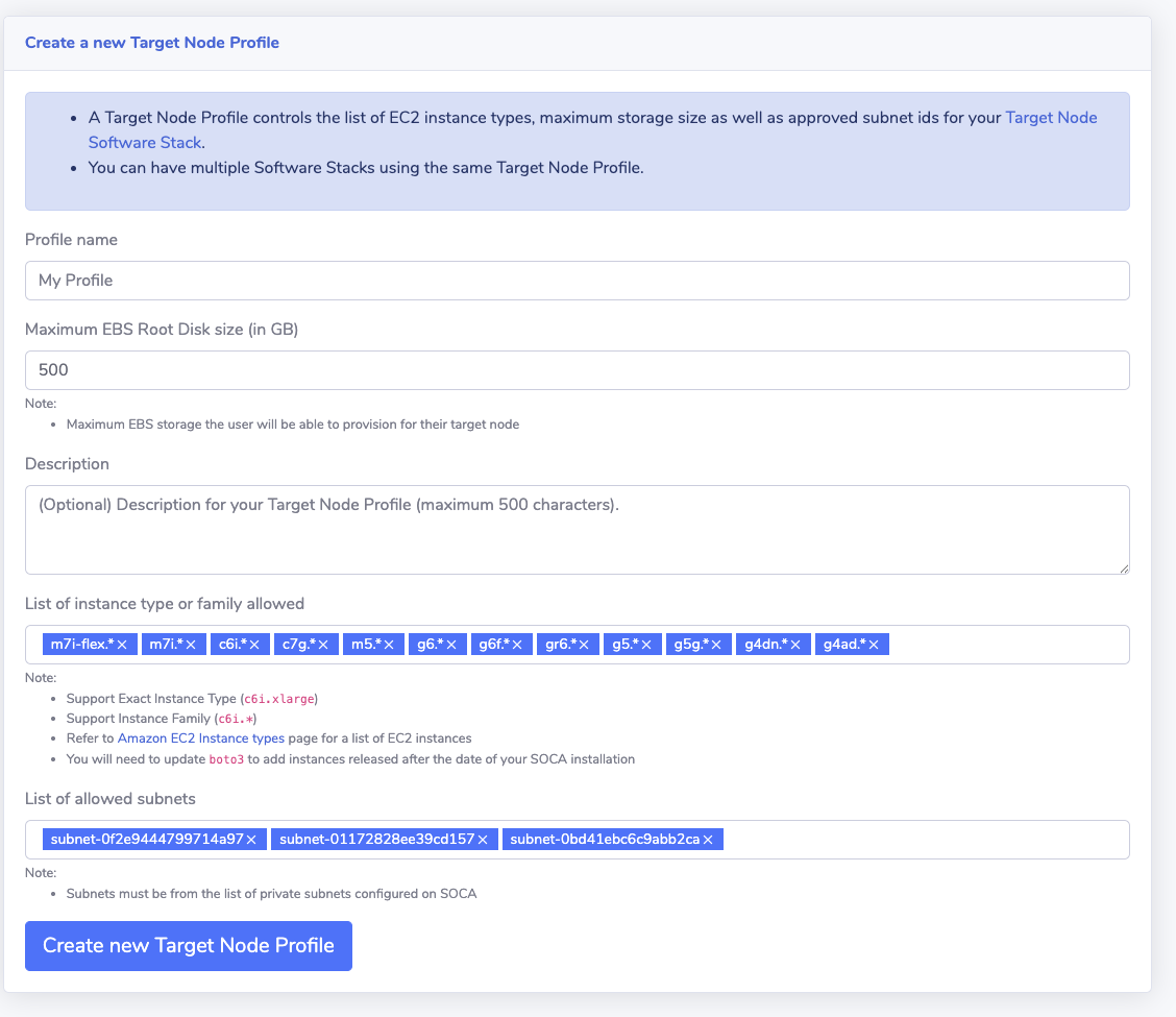 A Target Node Profile controls the list of EC2 instance types, maximum storage size as well as approved subnet ids for your Software Stacks.