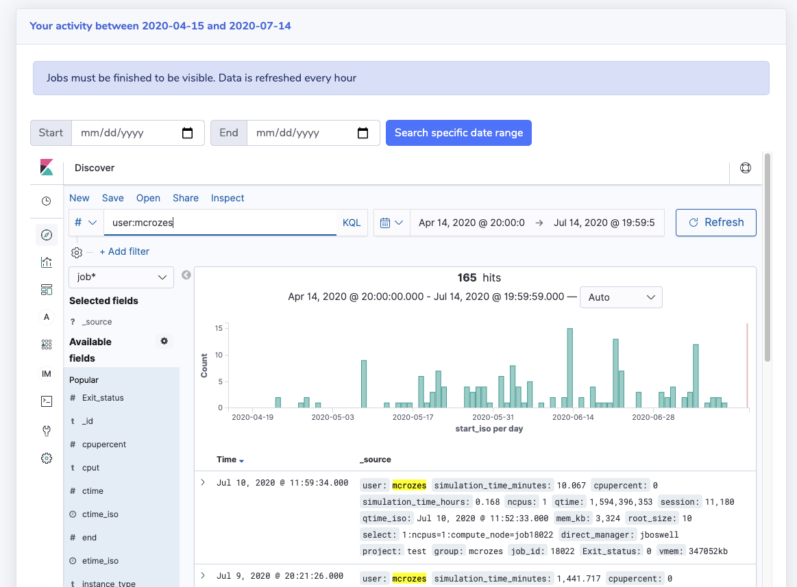 "My Activity" section let each user access their Kibana dashboard pre-configured with user and date filters.