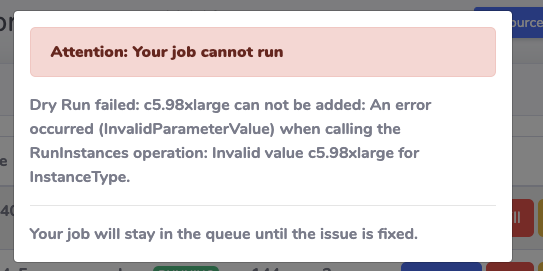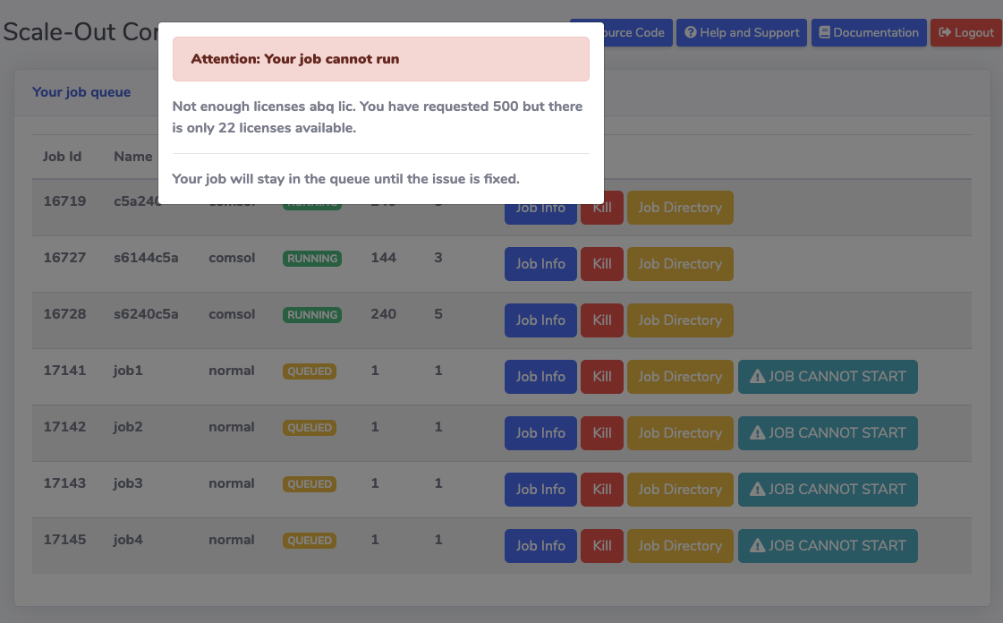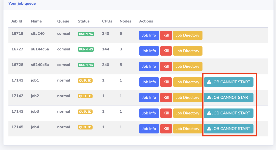 Users can understand why their jobs are blocked by clicking the "Job cannot start" button. Some examples includes:
