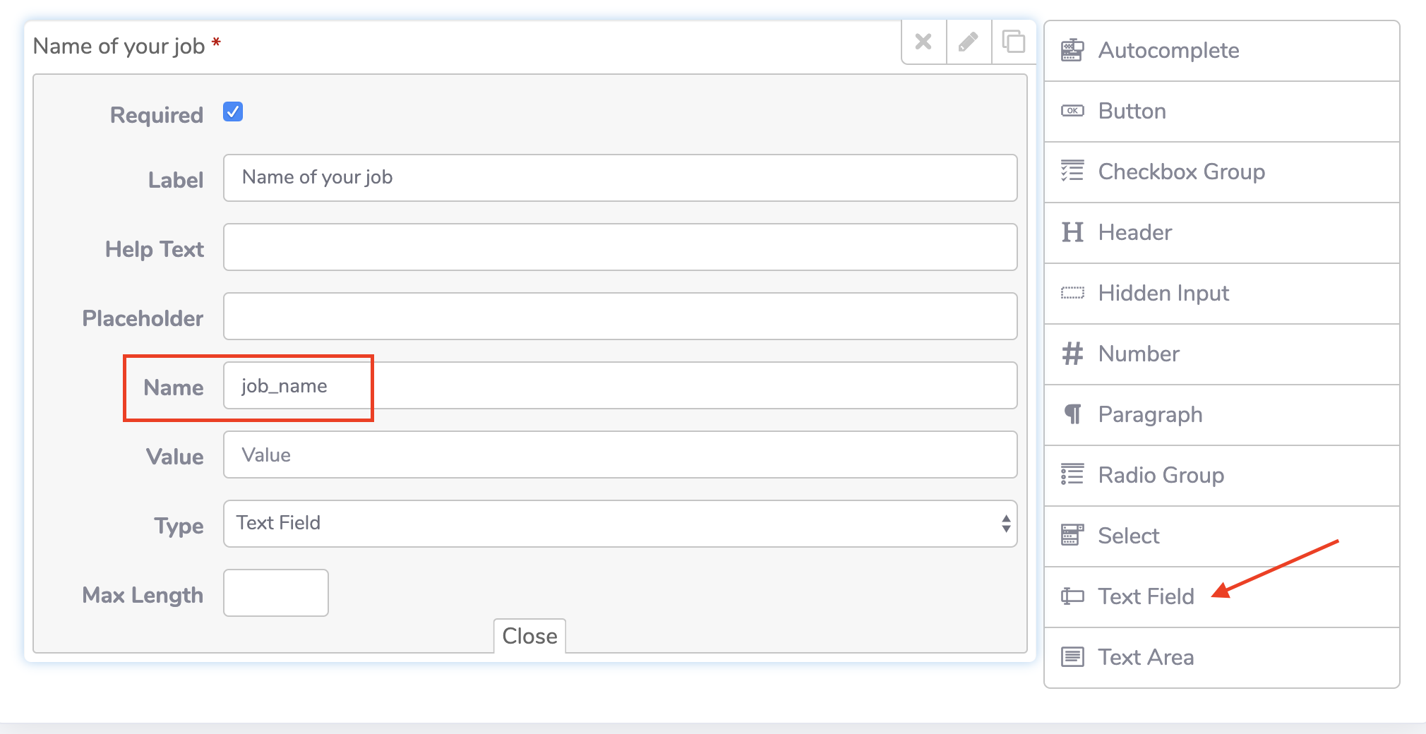 Configure the widget and configure the Name settings (red) with the variable name associated (job_name in our example)