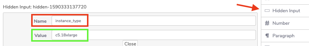 We want to enforce the instance type to be c5.18xlarge. To do that, you can simply hardcode the information on the job script or create a "Hidden Input" parameter. The red section references to the variable name and the green section is the variable value.