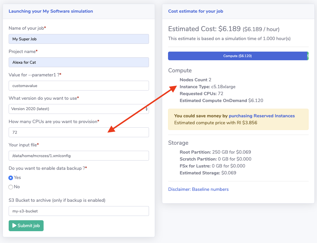 also determine the number of nodes to provision automatically based on the instance type and cpus requested. In this example, the instance is c5.18xlarge (36 cores) and the number of CPUs requested by the user is 72. automatically detect these values and determine the number of instances to provision is 2