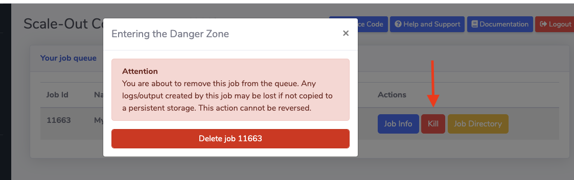 To delete a job, simply navigate to "My Job Queue" section and click on the "Kill" button