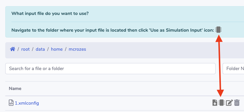 To submit a job, first navigate to "Submit Job (Web)" on the left sidebar. Choose your input file and click "Use as Simulation input" icon