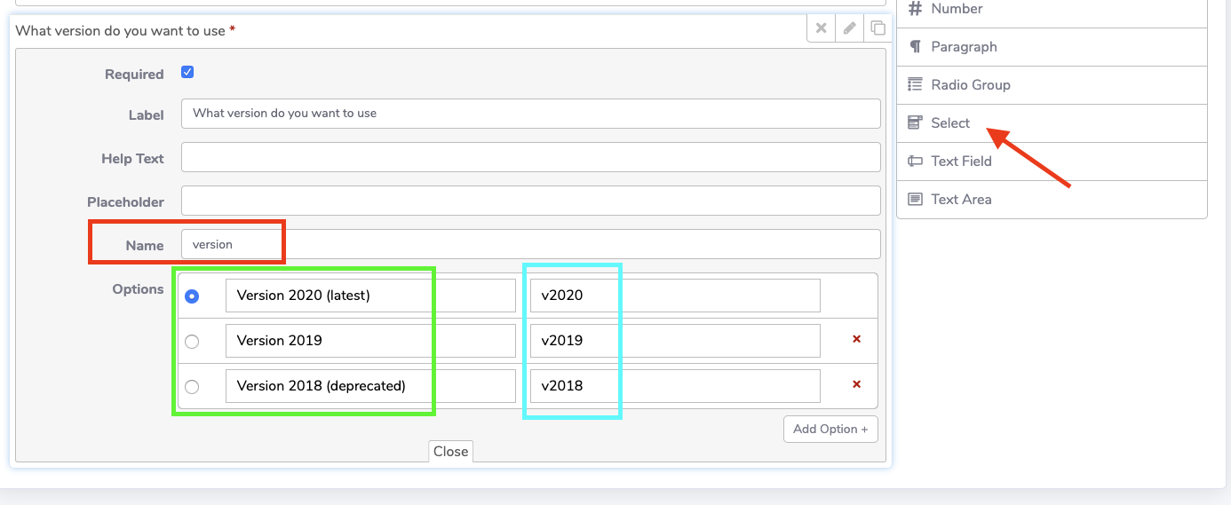 Similarly to the previous examples, check the "Required" checkbox, map the "Name" to your variable name (%version%) and add labels (green) and their associated values (blue)