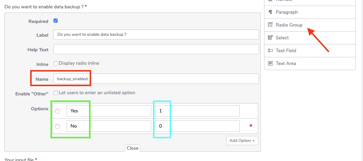 %backup_enabled% is a boolean which enable (1) or disable (0) archival of the job output data to S3. This time use "Radio Group" component and configure the different values: