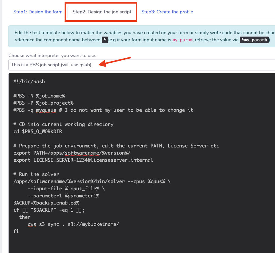 Once your HTML form is done, simply click "Step2" and copy/paste your job script