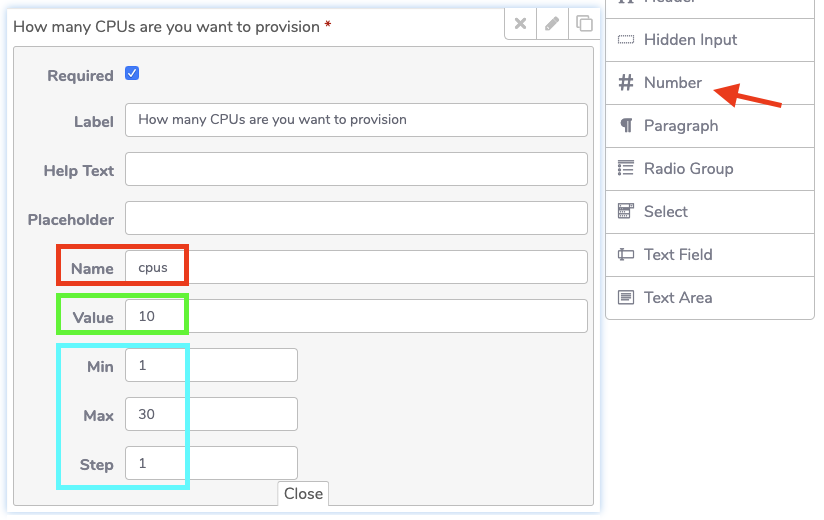 Specify a name which match your variable name (red), pick the default value (green) then choose the Min/Max/Step values allowed (blue)