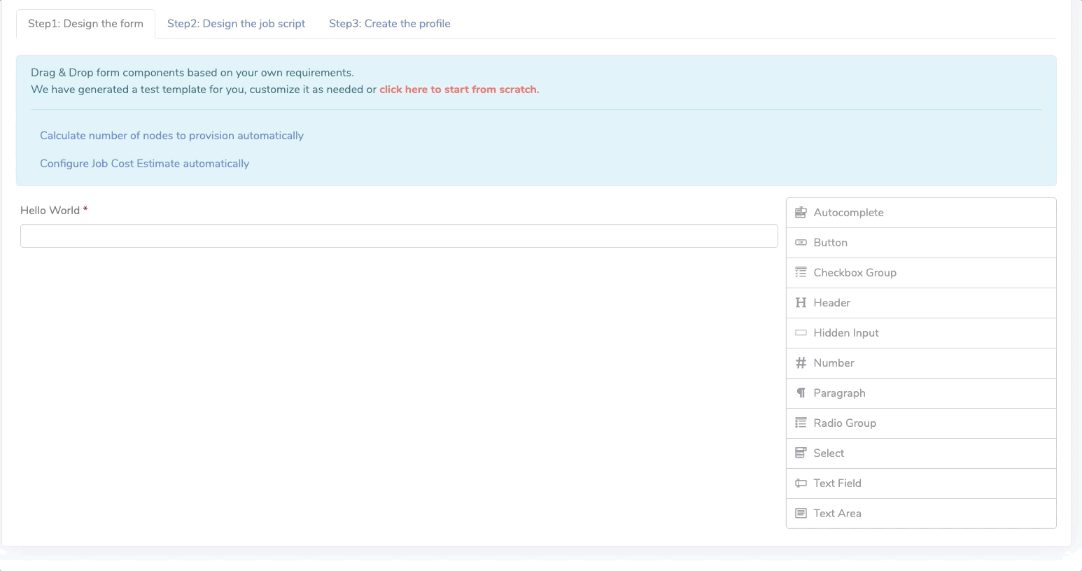 features a complete visual form builder experience with simple drag & drop capabilities. HPC admins can build their own forms without any coding/HTML experience via an intuitive wysiwyg (What You See Is What You Get) solution.