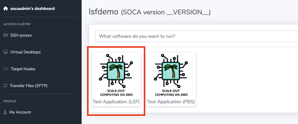 Once your system is up and running, load your lsf shell by running soca_lsf-<scheduler_identifier> on your machine, where <scheduler_identifier> is a unique identifier automatically generated by SOCA.